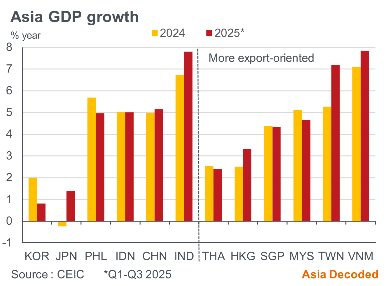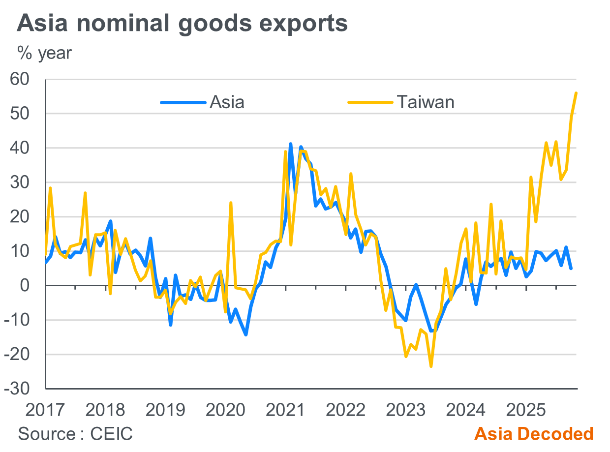 Growth was largely driven by strong exports. Merchandise exports grew 7.5% y/y in Jan-Oct 2025, led by double-digit growth in Taiwan, Vietnam, Malaysia, Thailand and Philippines. This compared with full year growth of 10.2% in 2024.