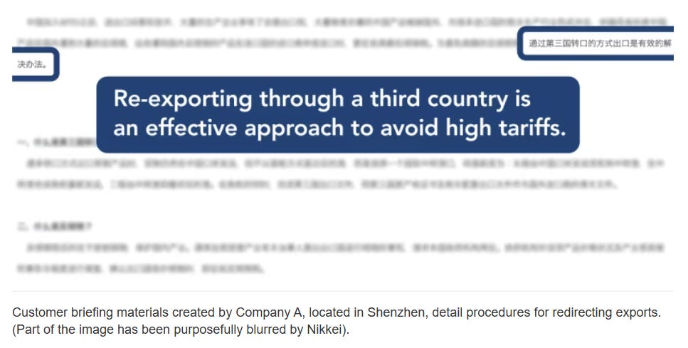 A Nikkei investigation has found that multiple Chinese trading companies propose to their clients that they can avoid the U.S.’s high tariffs by first sending their U.S.-bound exports to Vietnam.