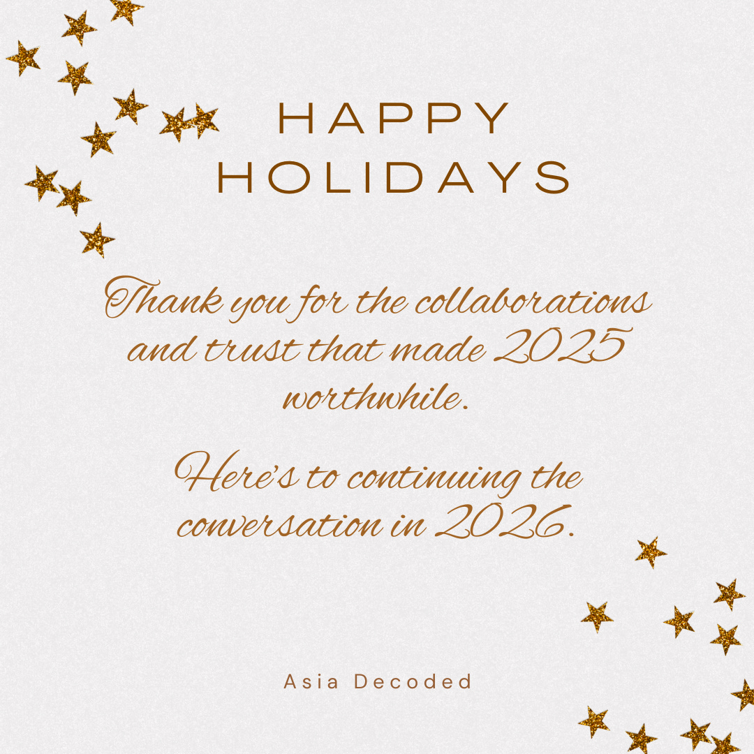 Happy Holidays!2025 was another reminder that Asia’s economic story is complex, contested, and constantly evolving. 2026 promises plenty more to unpack.Priyanka KishoreDec 24, 202521SharePreviousNext