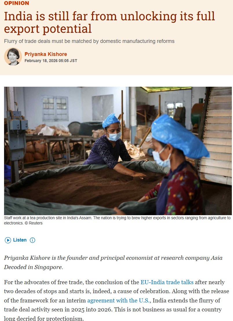The design of the older FTAs alone are not responsible for their poor performance. At the heart of the matter lies India’s weak domestic manufacturing capabilities. I argue in this Nikkei op-ed that for the new generation FTAs to deliver the economic and productivity gains of opening up, the domestic manufacturing reforms must pick pace.