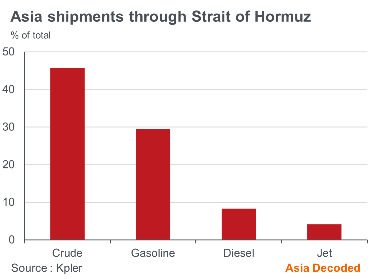 Asia has enough stockpiles to weather at least a month of import disruptions. It'll still feel the impact of higher oil prices unless there is major de-escalation in the Middle East soon.